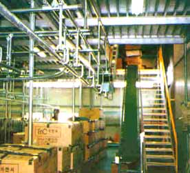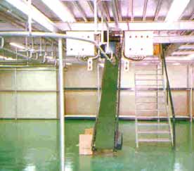 ◇ 벨트 컨베어 (메저닌 플로어 설치) 층간 이동의 대명사이며 부드럽고 안전한 이동이 보장되며 각층별 침 수평연결라인 구축이 가능하다.